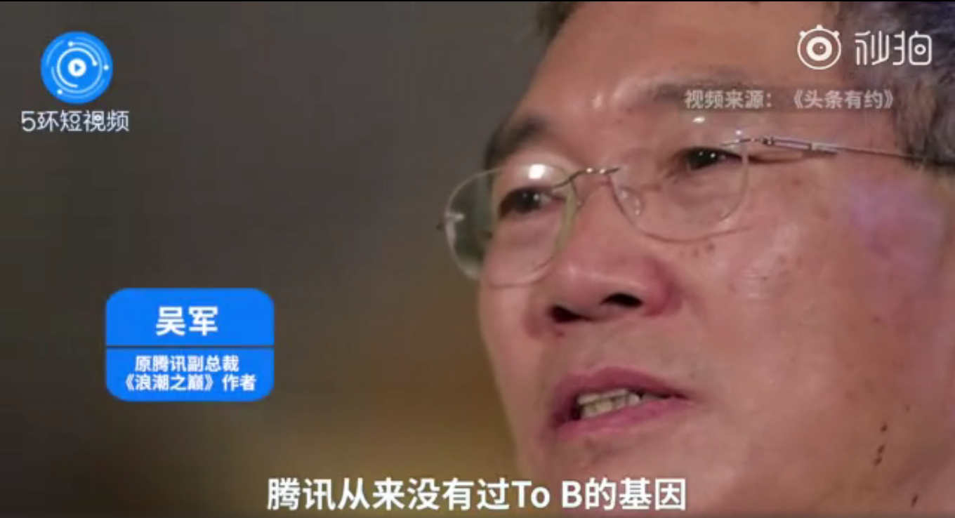 近日,腾讯原副总裁吴军接受《头条有约》采访时表示:腾讯从来没有ToB的基因。