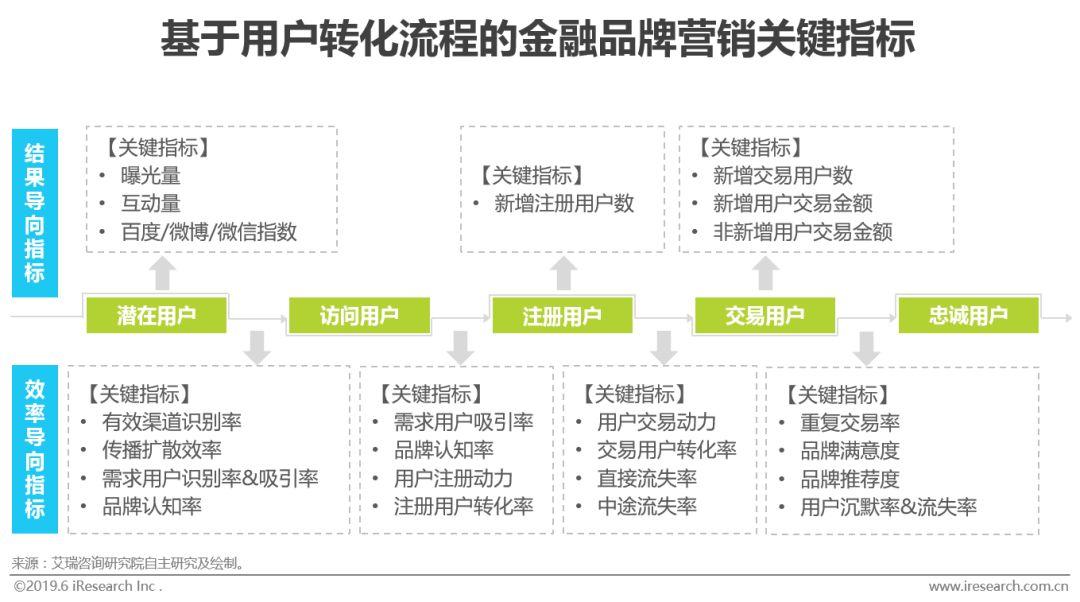 金融品牌营销的效果衡量指标可以分为结果导向指标和效率导向指标两类,结果导向指标主要包含曝光量、用户数、交易金额等能够较为直接反映规模或效益的指标,效率导向指标主要包含扩散率、认知率、转化率、满意度等表示转换程度或态度的指标。目前,不少互联网金融企业更加侧重结果导向指标,以此作为各类品牌营销方式的考核指标,而在实际品牌营销的过程中,效率导向指标的价值不应被忽视,它能够帮助企业发现品牌营销方式甚至产品的优化空间。