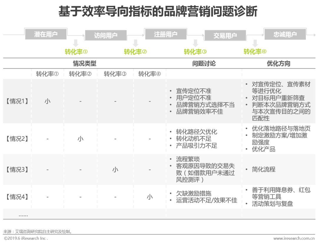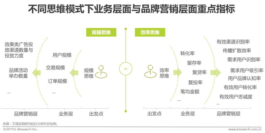 对于身处不同生命周期的互金企业来说,其业务层面和品牌营销层面的关注重点通常有所区别。处于起步阶段或刚刚进入快速发展期的互金企业常被规模思维主导,交易规模、用户数量、订单数量等规模指标通常是这一阶段互金企业的关注重点,而反映到品牌营销层面上,表现为全渠道、大力度投放效果类广告,通过大量的品牌活动增加曝光、提升知名度。到了快速发展阶段后期或成熟阶段,效率思维的重要性愈发凸显,效率思维是对规模思维更为精细的拆解,业务层面应重点关注转化率、留存率、单位贡献等效率指标,而品牌营销层面应更多思考如何提高有效渠道和有效用户的识别率、传播扩散效率、有效用户转化率等问题。在跑马圈地式扩张行之不通、存量流量争夺乏力、合规整改帷幕将落、互联网金融回归本质之际,互金企业应以单位效率为核心发力点,通过每一业务/营销单元的细节深挖,提升品牌营销竞争力。