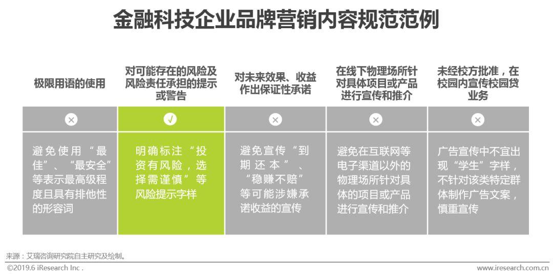 自2013年以来,随《中华人民共和国广告法》的修订以及一系列互联网金融政策的颁布(具体政策分析见后“驱动因素-政策”),金融科技企业对外宣传内容的规范性得到了愈发严格的管理。这种内容严格管理具体表现在风险提示、未来效果承诺、夸大/片面/虚假宣传、线下宣传推介内容、推荐证明等方面,以保证金融机构、金融活动及有关金融产品和金融服务的真实性与合法性。相较于互联网金融广告监管发力之前的野蛮式宣传,金融广告趋于理性管理与传播,这样一来鞭策金融广告主在内容制作与对外宣传过程中保持自律,引发金融广告主重新思考品牌营销工作的本质与方式;二来一定程度上抵制不正当竞争,整肃行业环境;三来有效维护了金融消费者权益。