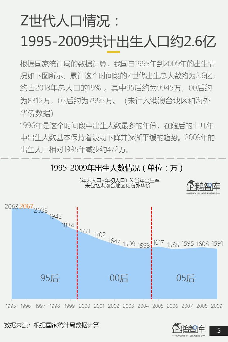 根据国家统计局的数据计算,我国1995年到2009年的出生的人口(Z世代),总人数约为2.6亿,约占2018年总人口的19% 。其中95后约为9945万,00后约为8312万,05后约为7995万。(未计入港澳台地区和海外华侨数据)。