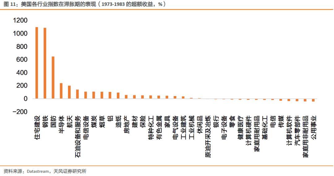 2、从股票市场结构来说,不同国家在滞胀环境下表现出来的特点不同(美国传统行业股价好、日本新兴产业股价好),各个行业板块的股票表现,在通胀高企的背景下,中长期来看,本质上是由盈利优劣决定的,而盈利背后则是产业政策的导向和产业自身发展的规律。