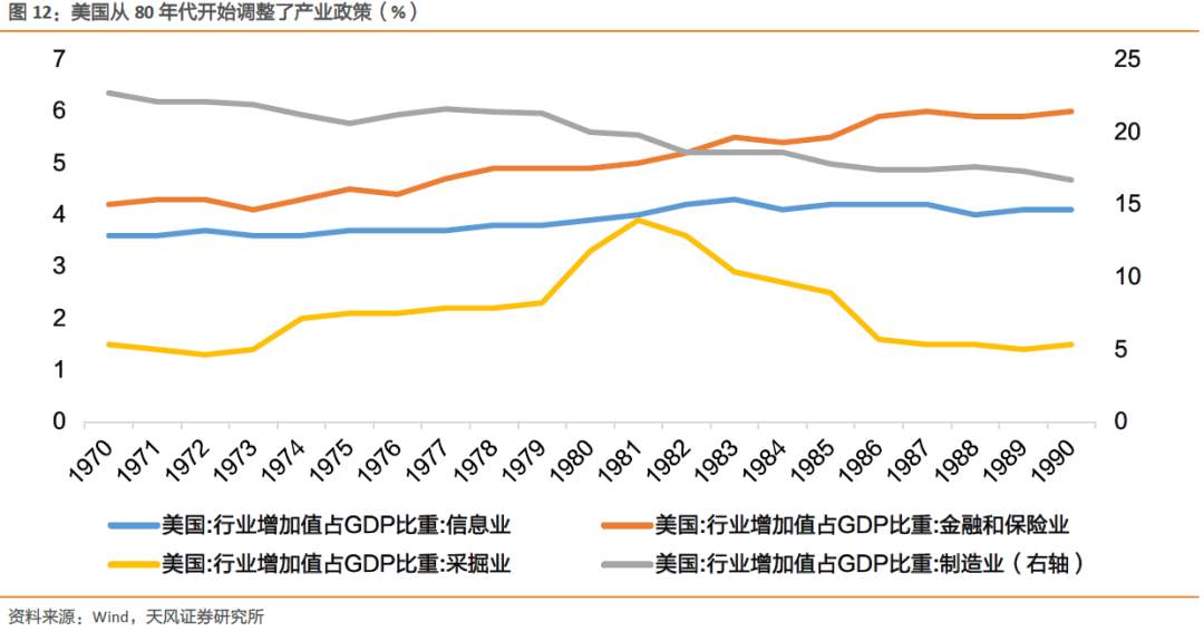 这背后是70-80年代美国对于传统行业的依赖度较大,尤其是在应对全球政治问题和能源紧张问题下,继续发展国防、航天、石油、金属、钢铁等行业。而从80年代之后,美国开始大力发展新兴产业,制造业、采掘业等传统产业占比开始下降,信息科技、金融保险占比提升。