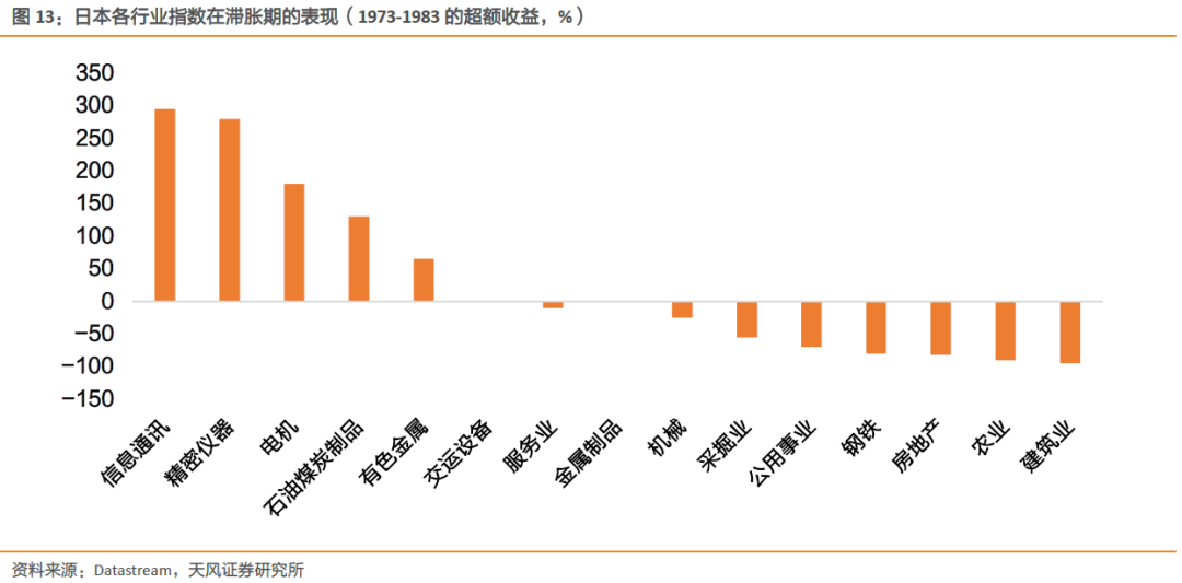 从日本滞胀期(1973-1983)各个行业的超额收益来看,细分行业表现较为突出的是:信息通讯,精密仪器,电机、石油煤炭、有色金属等,其中前三者超额收益率远远高于同期的东京证交所股价指数;表现较差的主要集中在公用事业、钢铁、房地产和采掘业等产业。