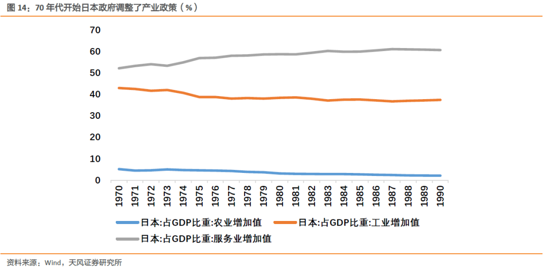 行业的分化表现背后和日本的产业结构调整密切相关,日本政府自70年代开始就大力调整产业结构,对新兴产业给予较强的政策支持与补贴,同一阶段我们可以显著的看到服务业占比的提升和工业占比的下降。