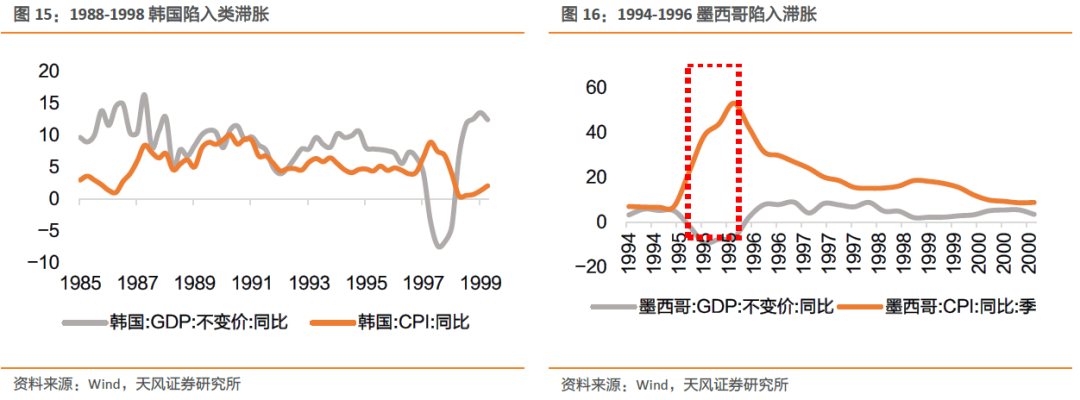 在1988年之前,韩国经历了一个高速增长的阶段,随后在90年代初一路下滑,甚至在金融危机期间转负,与此同时,CPI同比增速则一路上行且维持在高位。同期的墨西哥也出现了类似的情况。1995年开始,墨西哥的GDP增速由正转负且1995年全年都为负,同时CPI增速直线攀升到超过40%的水平。