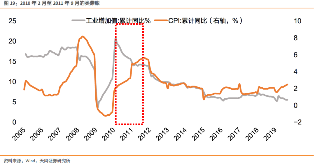 类滞胀环境在国内比较典型的一次是在2010年2月至2011年9月。期间,CPI累计同比从2.1%一路攀升至5.7%,同时,工业增加值累计同比从20.7%降至14.2%。这次类滞胀产生的原因来自于四万亿刺激消退之后,经济增速放缓;而货币政策快速收紧后(M2从26%降至13%,M1从35%至9%)存在传导时滞,价格仍惯性上涨。之所以称之为类滞胀,是因为相比于20世纪70年代发达国家的滞胀表现,要更加缓和的多。