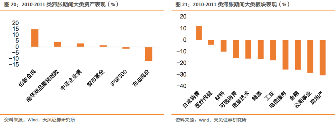 大类资产表现:黄金>原油>货币>债券>商品>股票。黄金的抗风险和抗通胀属性突出,而股、债和商品受高利率和盈利向下的影响,在滞胀期间表现很弱。
