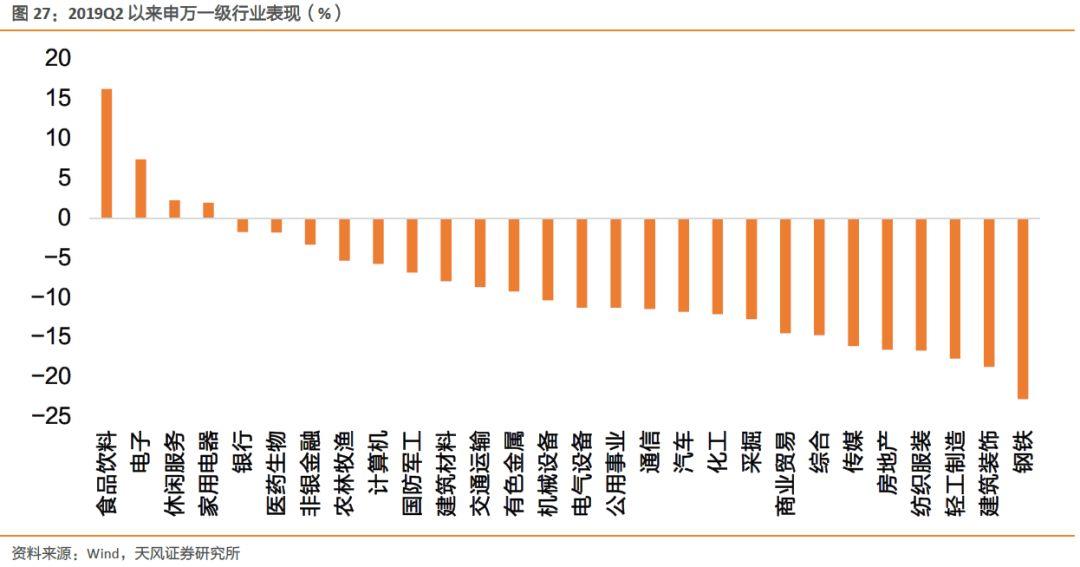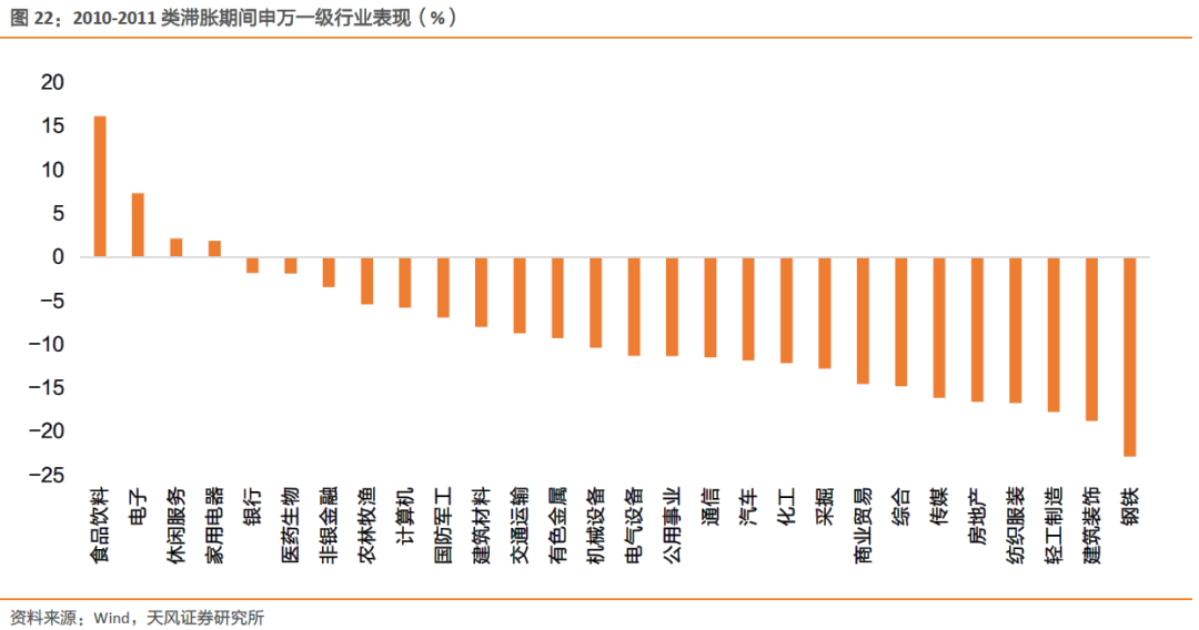 行业表现:食品饮料(19.6%)>有色(4.4%)>机械(1.2%)>采掘(0%)>建材(-3.2%)>电子(-4.8%)>军工(-5.8%)>医药(-6.7%)。有色的表现主要得益于黄金,军工受主题事件驱动,机械、采掘和建材的涨幅主要来自滞胀的前半段,经济刺激后的景气度还在。从结构上看,食品饮料、医药、纺服、家电和农业等消费行业在整个滞胀期间表现都较突出,而在滞胀后半段,银行作为低估值的配置品种,涨幅也开始跑在前面。