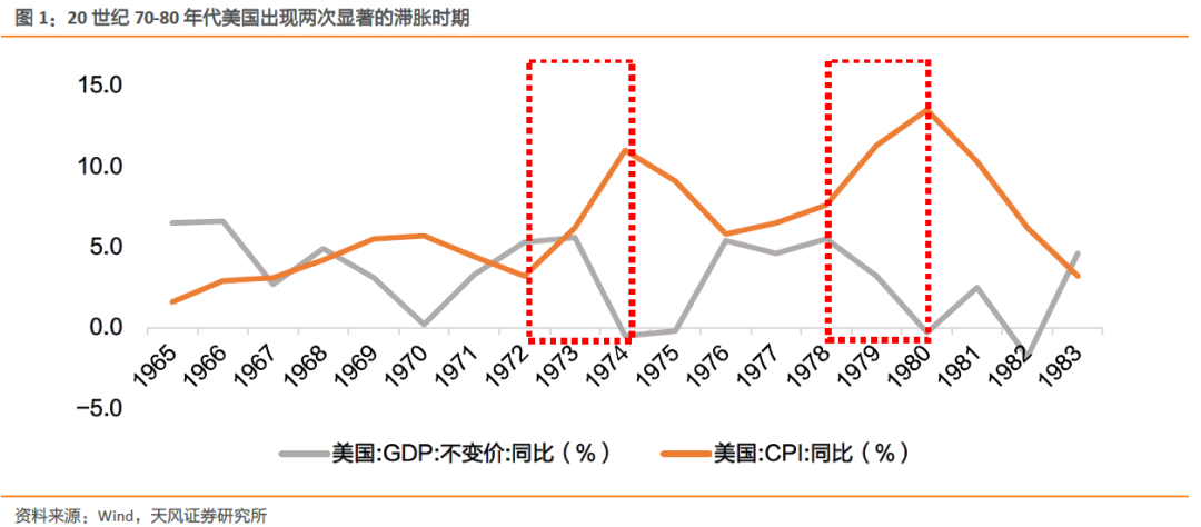 美国在20世纪70-80年代经历了两次比较明显的滞胀。70年代初期,美国经济发生断崖式下滑,实际GDP增速在1972-1974年之间由正转负,而CPI同比增速从1972年的3.2%快速攀升至1974年的11.0%,通胀水平快速上升。而在70年代末期,CPI增速再度大幅上行,而经济增速也再度掉头向下。