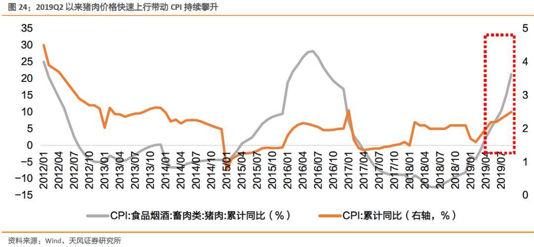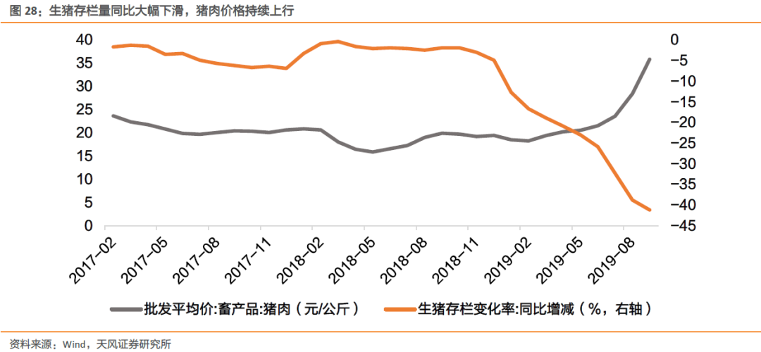 从当前时间点来看,未来一到两个季度这种类滞胀的状态可能仍将持续。一方面,贸易摩擦仍然存在较大的不确定性,产业结构转型尚未完成,经济增速继续放缓仍然是大概率事件,从库存周期不会更差的角度来说,经济最好的情况就是出现1-2个季度的阶段性走平;另一方面,从生猪存栏量持续下跌的情况来看,猪肉供给短缺引发的结构性通胀水平攀升或将持续到2020年上半年。并且,在工业品价格环比转正,同时基数开始大幅回落的情况下,11-12月“胀”的压力可能持续增加。