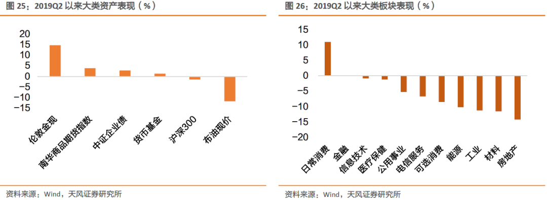 从大类资产的表现来看,黄金在此期间收益率领跑,而权益市场表现较弱;分行业来看,食品饮料板块表现最佳。
