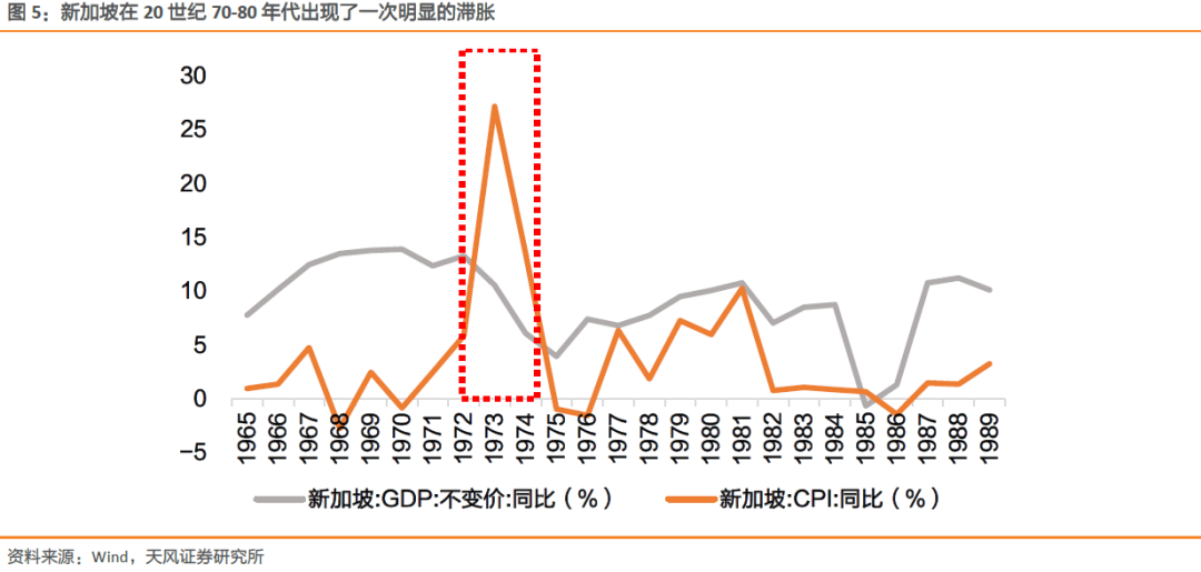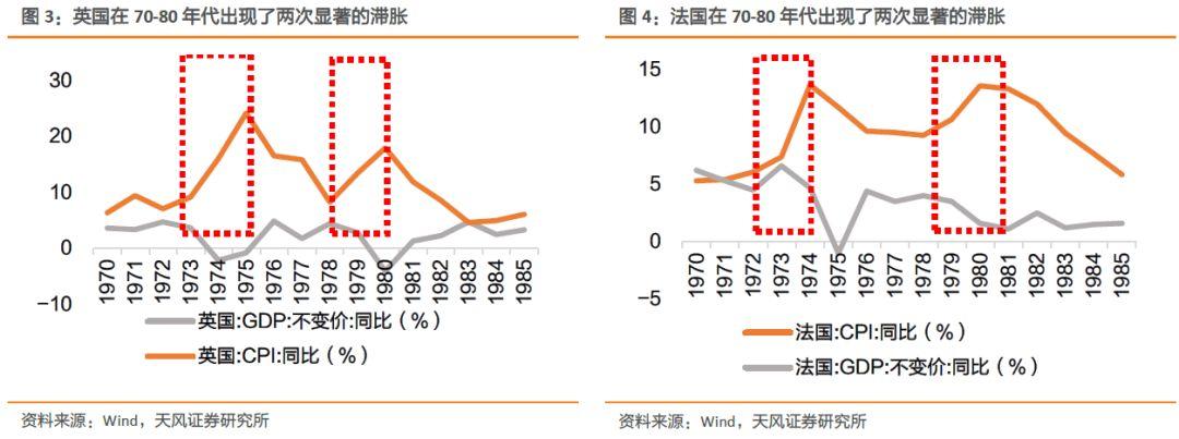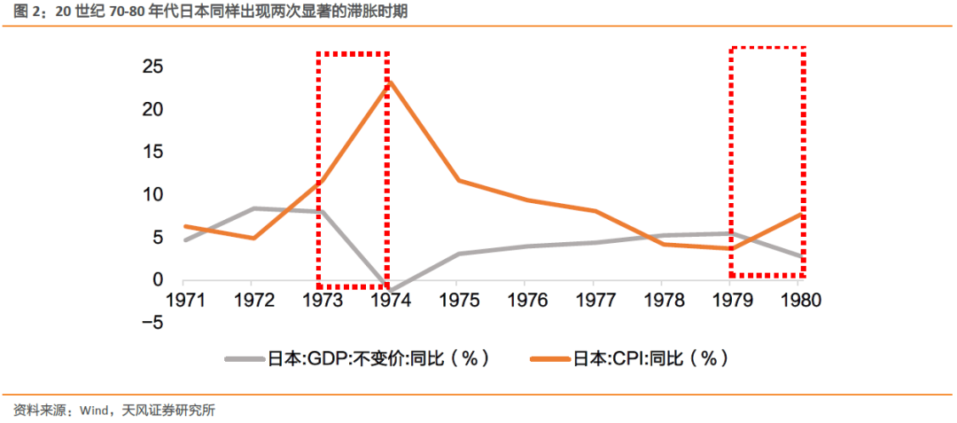 日本同样在20世纪70-80年代经历了两次滞胀。70年代初一路蹿升的CPI增速一度在1974年接近30%,而同期实际GDP增速却下跌到0%以下;随后在70年代末期,CPI同比增速再度上行,而实际GDP增速也从5%左右下滑到1%左右。