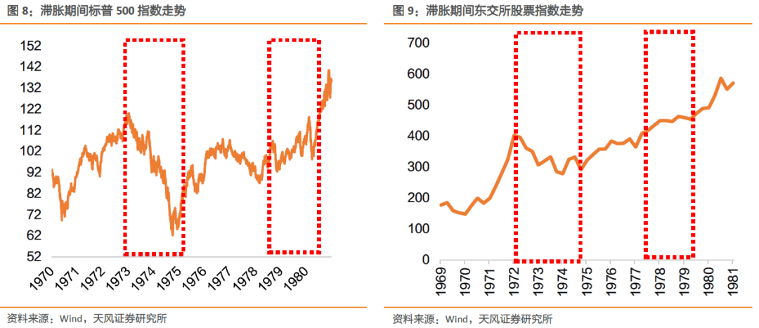 滞胀期间发达国家权益市场普遍表现较差,以单边下行和横盘震荡为主。以日美为例,两国股市在第一次滞胀期间普遍大幅下跌,而在第二次滞胀期间,则从单边下行转为横盘震荡。