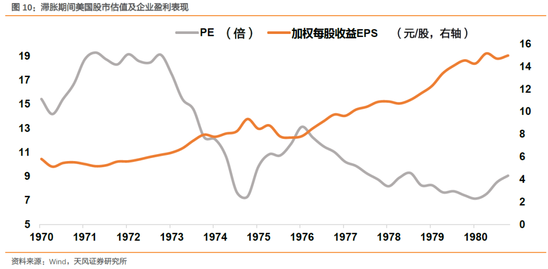 另一方面,随着通胀水平在高位保持稳定,名义企业盈利水平也随着通胀而上升,部分抵消了估值水平的大幅下挫,这也导致美日股市在第二次滞胀后期由大幅下跌转入震荡横盘。