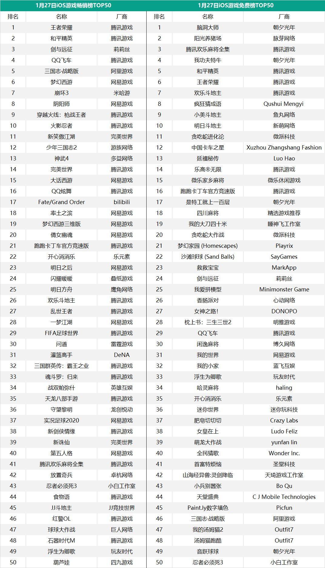 在iOS游戏畅销榜上,毫无疑问腾讯的《王者荣耀》和《和平精英》拿下了第一、第二的位置;除了《梦幻西游》,网易《阴阳师》重回TOP10;阿里游戏《三国志·战略版》稳居TOP5,而莉莉丝《剑与远征》成为春节档最大新游黑马……