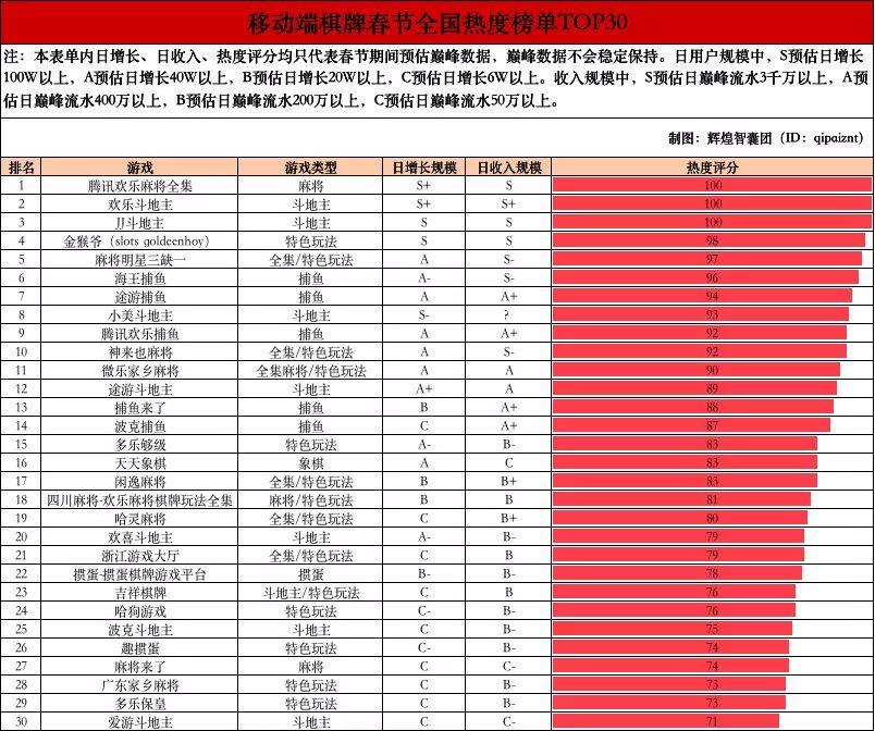 据“辉煌智囊团”的数据统计,部分大量级产品日巅峰增长突破百万级以上,日巅峰收入突破三千万以上,同样也是打破了历史记录。“辉煌智囊团”预估,今年春节棋牌圈整体涨幅将超200%。