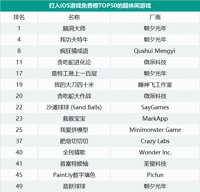 四、超休闲席卷iOS游戏免费榜,《脑洞大师》稳居TOP1