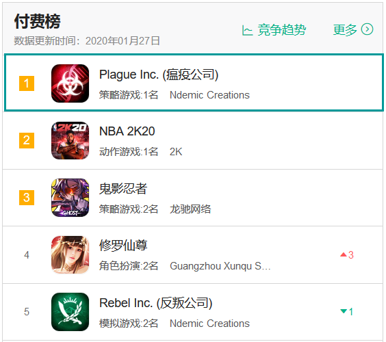 当然,除了以上表现出彩的产品,春节档还有一款不能忽视的游戏——《瘟疫公司》。受今年新型冠状病毒引发的一系列社会事件,这款以“病毒”为题材的策略手游吸引了大量玩家,成功霸榜iOS游戏付费榜。值得一提的是,其开发商另一款产品《反叛公司》也打入了榜单TOP5。