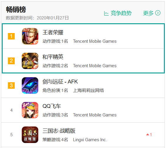 一、《王者荣耀》《和平精英》稳占畅销前二