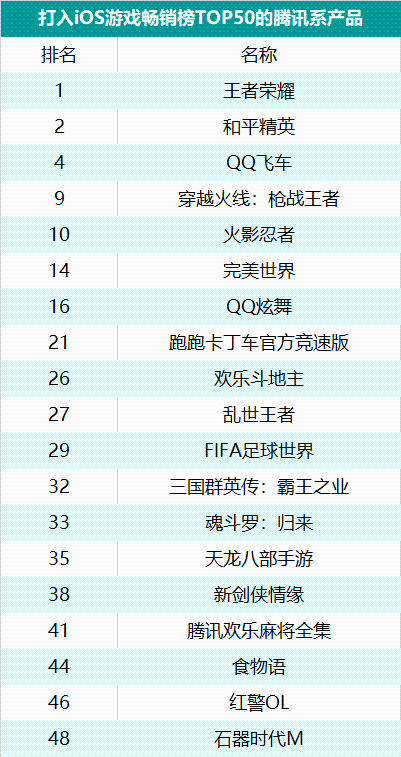 除了这两款TOP手游,腾讯还有16款手游打入TOP50,比如《QQ飞车》《穿越火线:枪战王者》《火影忍者》等等,《欢乐斗地主》《腾讯欢乐麻将合集》等棋牌类产品的排名也非常不错。就整体上榜产品数量而言,腾讯仍然是春节档的最大赢家。