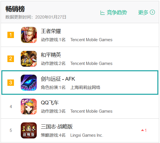 二、莉莉丝《剑与远征》成新游最大黑马,阿里游戏《三国志·战略版》稳居TOP5