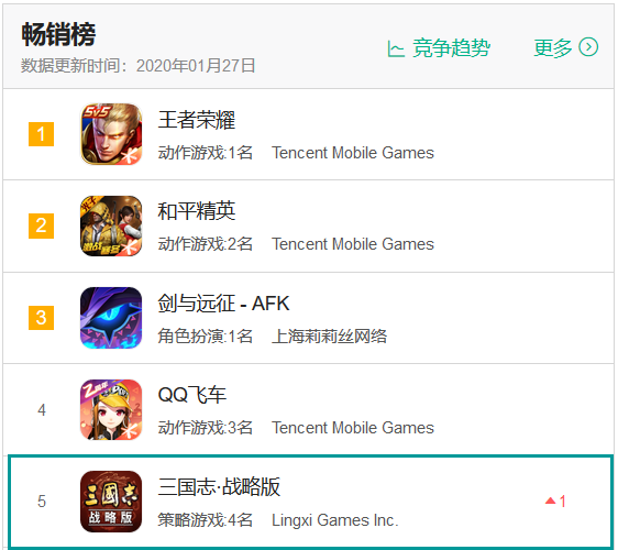 此外,阿里游戏的2019年爆款SLG《三国志·战略版》稳在了iOS游戏畅销榜TOP5内,为春节档表现最好的SLG手游。