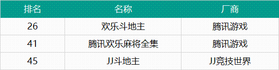从iOS游戏榜单来看,三款棋牌类产品打入了畅销榜TOP50,分别是《欢乐斗地主》(#19)《腾讯欢乐麻将全集》(#34)《JJ斗地主》(#39)。