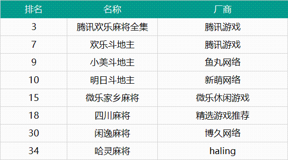 而在免费榜,则有8款棋牌类产品打入TOP50,比如《小美斗地主》《明日斗地主》《微乐家乡麻将》,还有《JJ斗地主》《广东家乡麻将》《浙江游戏大厅》这三款产品紧跟TOP50之后。