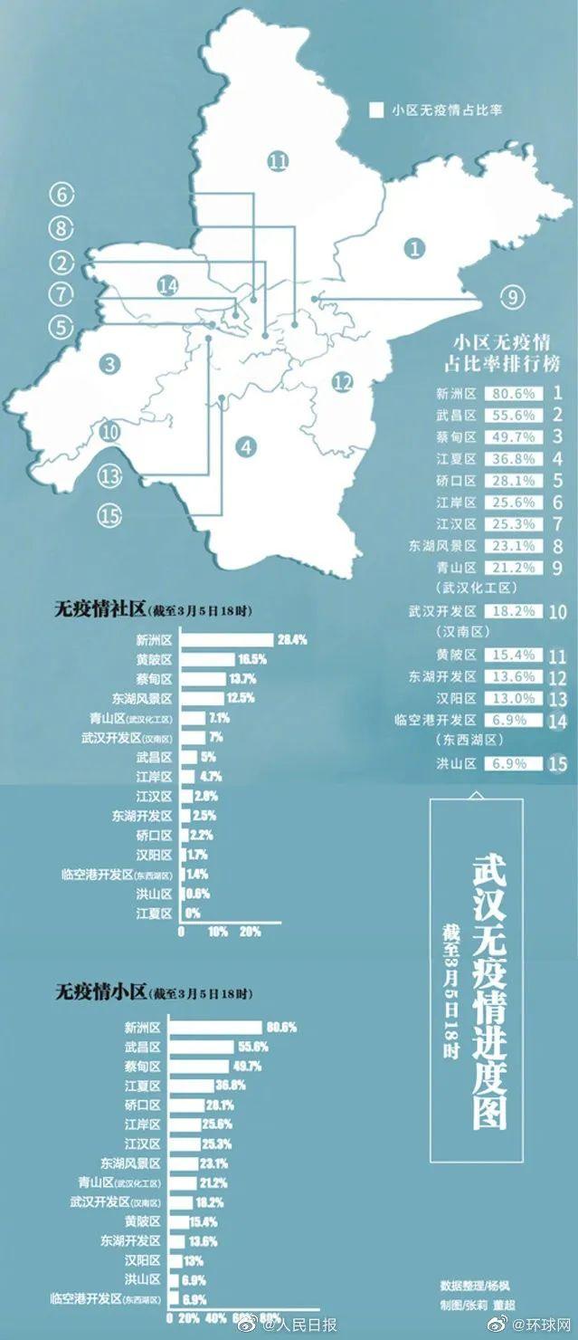 3月6日,武汉市新冠肺炎疫情防控指挥部社区疫情防控组公示全市第一批无疫情小区、社区、村(大队)名单。截至3月5日18时,全市无疫情小区2076个,无疫情社区79个,无疫情村(大队)1171个。截至6日,部分城区(开发区)公布认定办法、奖励措施,其中,无疫情社区(村、队)最高可获奖励20万元,相关的单位、个人也将获得奖励。