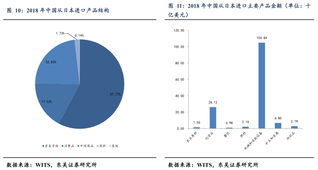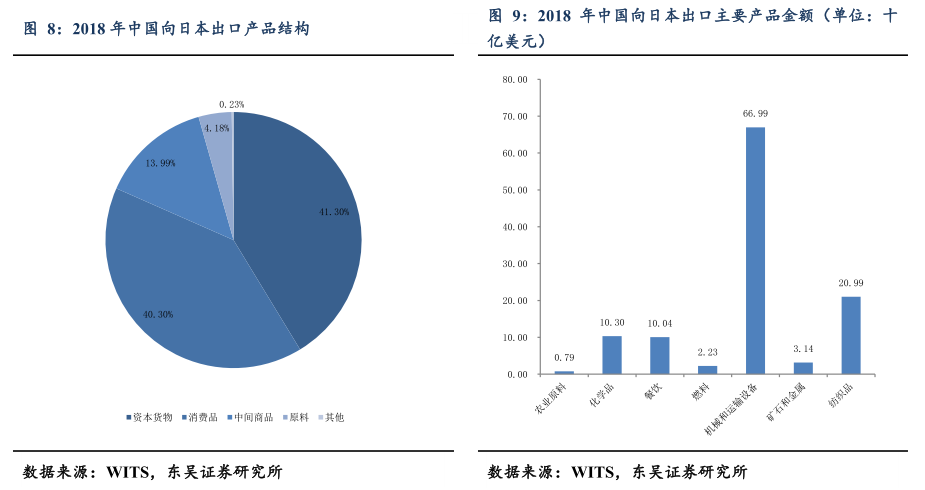 为何日本受冲击较大?历史沿革:(1)两次石油危机,抬升国内生产制造成本,急待分散化;(2)1985年广场协议后,日元迅速升值以纠正经常账户不平衡为“走出去”创造条件,制造业对外直接投资年超100亿美元,海外生产占比逐年攀升,发生产业“空心化”现象;(3)中美建交后,中国市场逐步做好准备,中国年吸引日资从1989年占亚洲比6.3%,占世界比1.3%,进入90年代后(除1999年)一直维持在占亚洲比20%-45%,占世界比6.5%-18.5%高位;(4)2018年中日进出口结构中资本货物占比均为最高:具体来看,中国向日本出口结构中消费品占比40.3%,中间商品(生产过程中的可变成本)占比13.99%,资本货物(生产过程中的固定成本)占比41.4%;日本向中国出口结构中消费品占比17.53%,中间商品占比22.83%,资本货物占比57.77%。