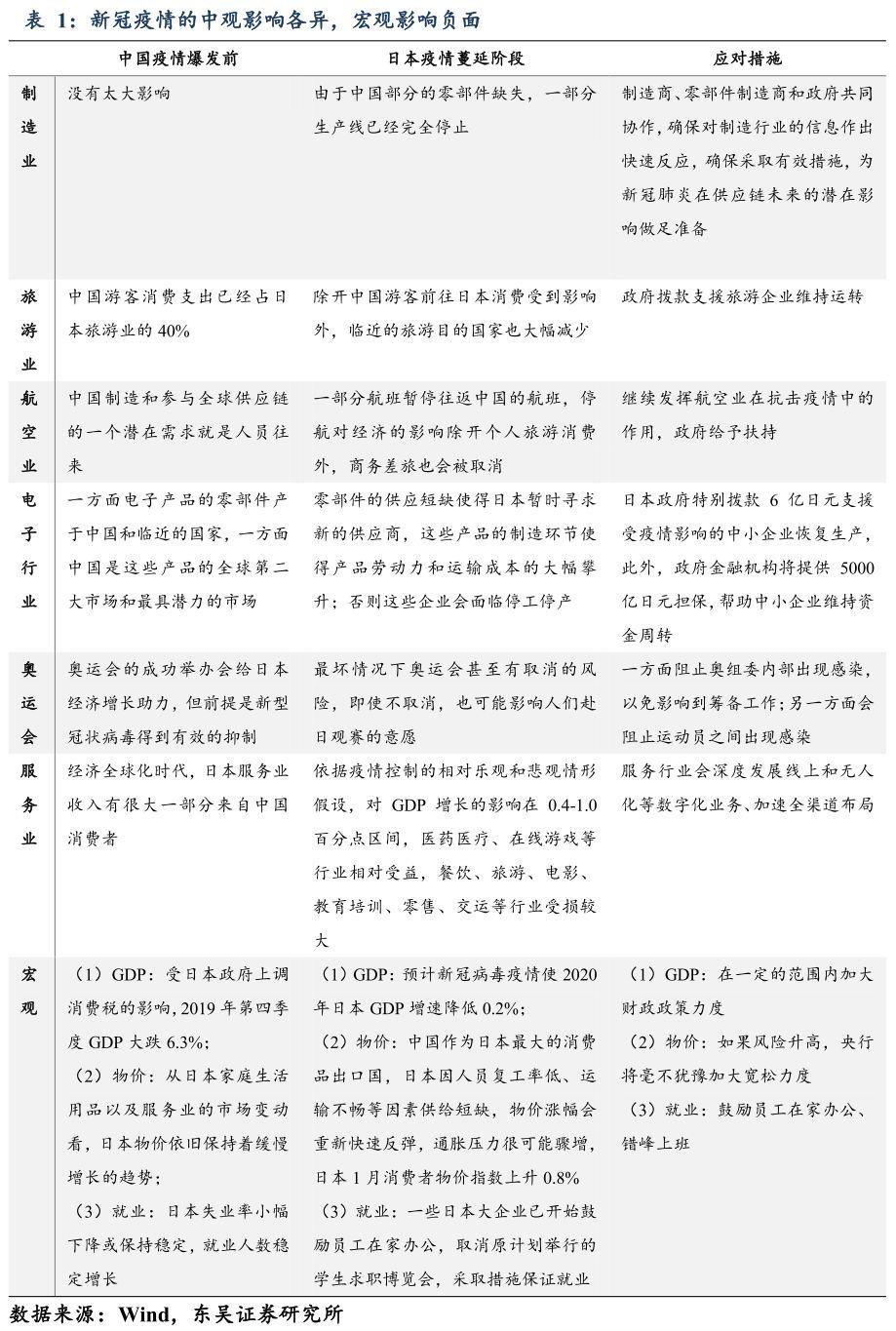 此次爆发的新冠疫情给整个社会带来了极大的影响,而由于中国和日本经济联系的密切,也为日本各行各业带来了一定的影响。日本对中国制造商和供应商的敞口很高,中国的电子行业进口了大量日本零部件,因而日本的生产会受到中国疫情影响。除开制造业与供应链,日本的旅游业、航空业、服务业等也会因为疫情导致的人员往来减少和贸易交往受限受到负面的影响。为了缓解上述产业以及国家宏观经济的问题,日本政府也在积极探索阻击疫情、促进发展的应对措施,尤其是做好各项赛前准备活动确保今年在日本举办的奥运会赛事顺利开展。