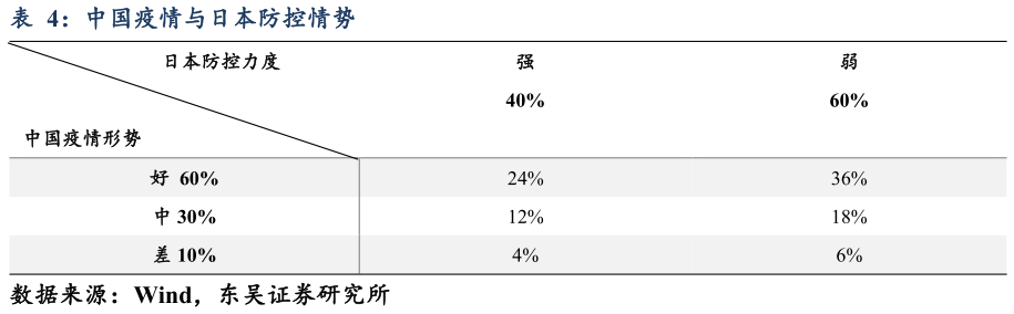 新冠疫情在向全球扩展,日本目前已经处于新冠疫情爆发的早期阶段,就目前情况来看,日本政府的防控力度,尤其是意愿还不太强,主要实行计划改变核酸检测的使用思路、减少对“密切接触者”观察、轻症患者居家“静养”的方案,而接下来的一到两周是疫情爆发的关键时期,日本境内迄今发现新型冠状病毒确诊病患800多人,老龄人口多、传染病适用医疗设施预备不足、多数企业员工照常通勤等,而这些因素可能构成日本防控疫情的挑战,医疗资源缺乏,欠缺全国体制,还有夏季奥运会举办之前的一系列准备工作和活动也都为新冠病毒的扩散提供了契机。因此,照目前日本政府的防控措施来看,力度还不够强。为此,我们推测日本针对此次疫情的防控力度强的概率为40%,防控弱的概率为60%。