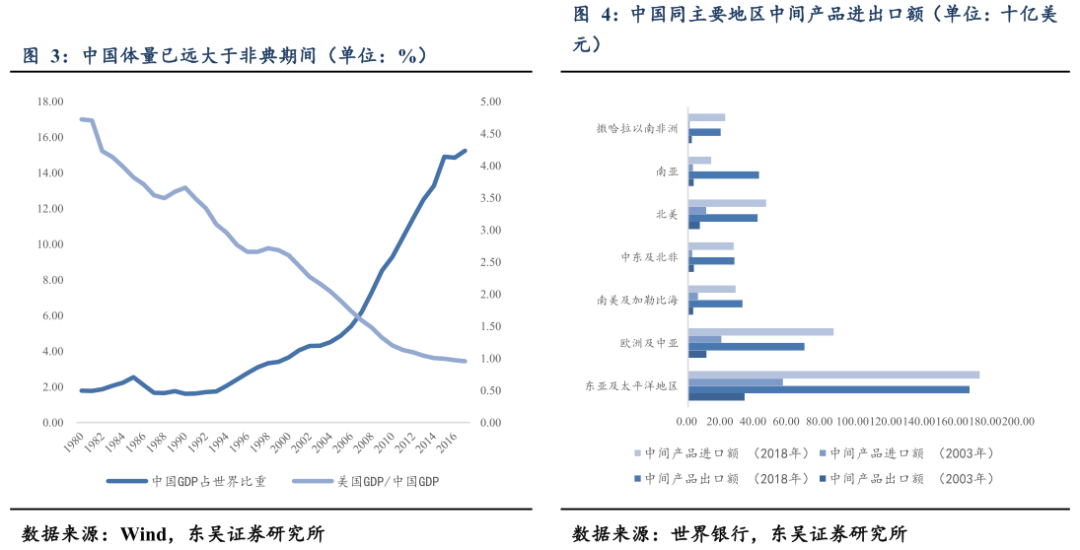 (2)2003年由于我国刚刚加入WTO,对世界经济的影响程度还相当有限,中国GDP占世界比重从当时2002年的4.29%已经上行到2019年的19.24%,近五分之一,嵌入全球产业链的程度更是无法忽视