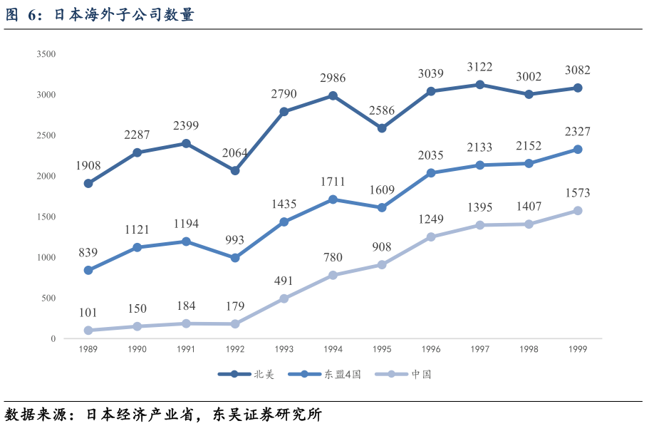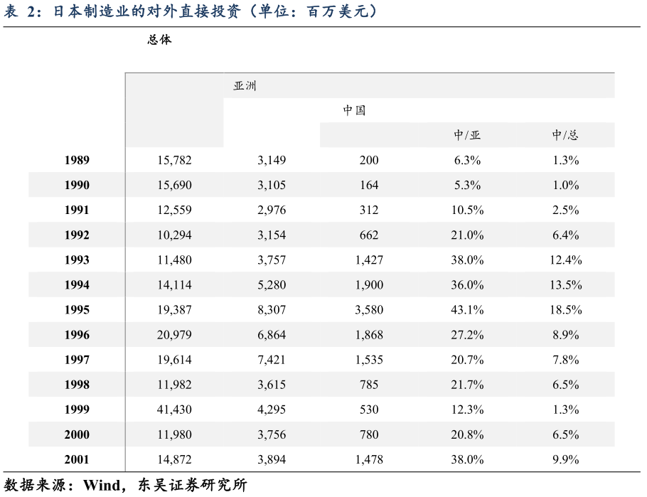 1985年广场协议签订后,日本的海外直接投资的全面展开,同日元的迅速升值互为因果,同步进行。虽然投资流量在80年代后半期到90年代初出现了很大的波动,主要是由于泡沫经济的产生和破灭,但是海外制造业的投资保持了相对稳定的增长。20世纪90年代及以后,尽管日本国内经济发展缓慢,但日本制造业的对外直接投资每年仍超过100亿美元(见表2),平均约有20%至30%的投资流向亚洲地区。由于投资的持续流动,日本公司海外子公司的数量一直在快速增长。子公司的数量的增加在北美,已吸引日本投资的最大分数自从1980年代,显然停滞在1994年之后,子公司位于东亚的数量相对稳定的持续增长。日本海外子公司的数量稳步增长,在东亚的鲜明对比让长期减少数量的新工厂建立在日本国内。20世纪90年代后半期,日本企业海外经营固定投资占国内固定投资的比例从不足10%上升到20%左右。日本制造企业持续的空间转移也反映在海外生产比例的大幅增长上,在过去十年中,海外生产比例增长了一倍多。