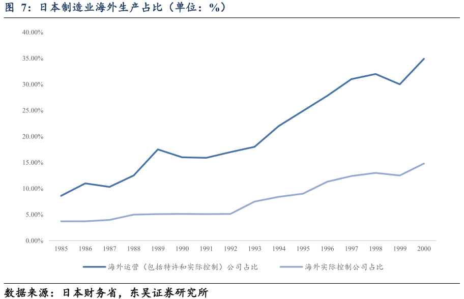 日本产业“空心化”的发生尽管部分人士乐观地认为日本工业的国际化将是一个机会对日本产业重组和升级其制造技术通过资源的重新部署到开发高附加值产品,与传统的夕阳产业被转移到海外。这将导致雁行形成生产、先进的技术工作是在日本完成的,媒介增值工作完成新兴工业化经济体(NIEs)等在亚洲——这种模式所带来的好处被视为技术水平的提高和产品生命周期的延伸超越日本和西方市场。不幸的是,对日本制造业而言,这似乎没有得到数据的证实。日本企业追求其自身的战略利益,其海外子公司越来越多地被用作国内生产的直接替代品,简而言之,日本全球化的所谓好处如何兑现尚不明朗。