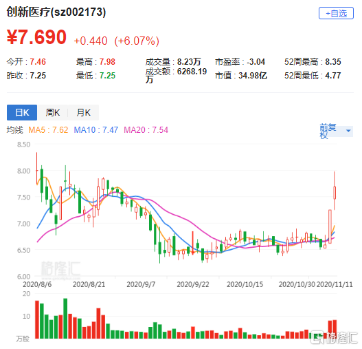 格隆汇11月11日丨昨日涨停的创新医疗(002173.SZ)快速拉升触及涨停后回落,现报7.69元,涨幅6.07%,最新总市值35亿。公司昨日公告称,富浙资本基于对公司未来持续发展的信心,于2020年10月29日-11月9日通过集中竞价方式进一步增持公司股份348.1442万股,占公司总股本的0.77%。