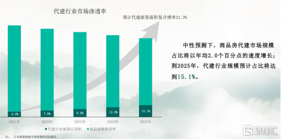 根据中国指数研究所报告,在中性预测下,商品房代建市场规模占比将以年均2.0个百分点的速度增长;到2025年,代建行业规模预计占比将达到15.1%,新签代建面积复合增率21.3%。