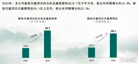 2020年全年,绿城管理新拓代建项目的合约总建筑面积达18.7百万平方米,较去年同期增长约16.8%;新拓代建项目代建费预估58.1亿人民币,较去年同期增长约22.3%。