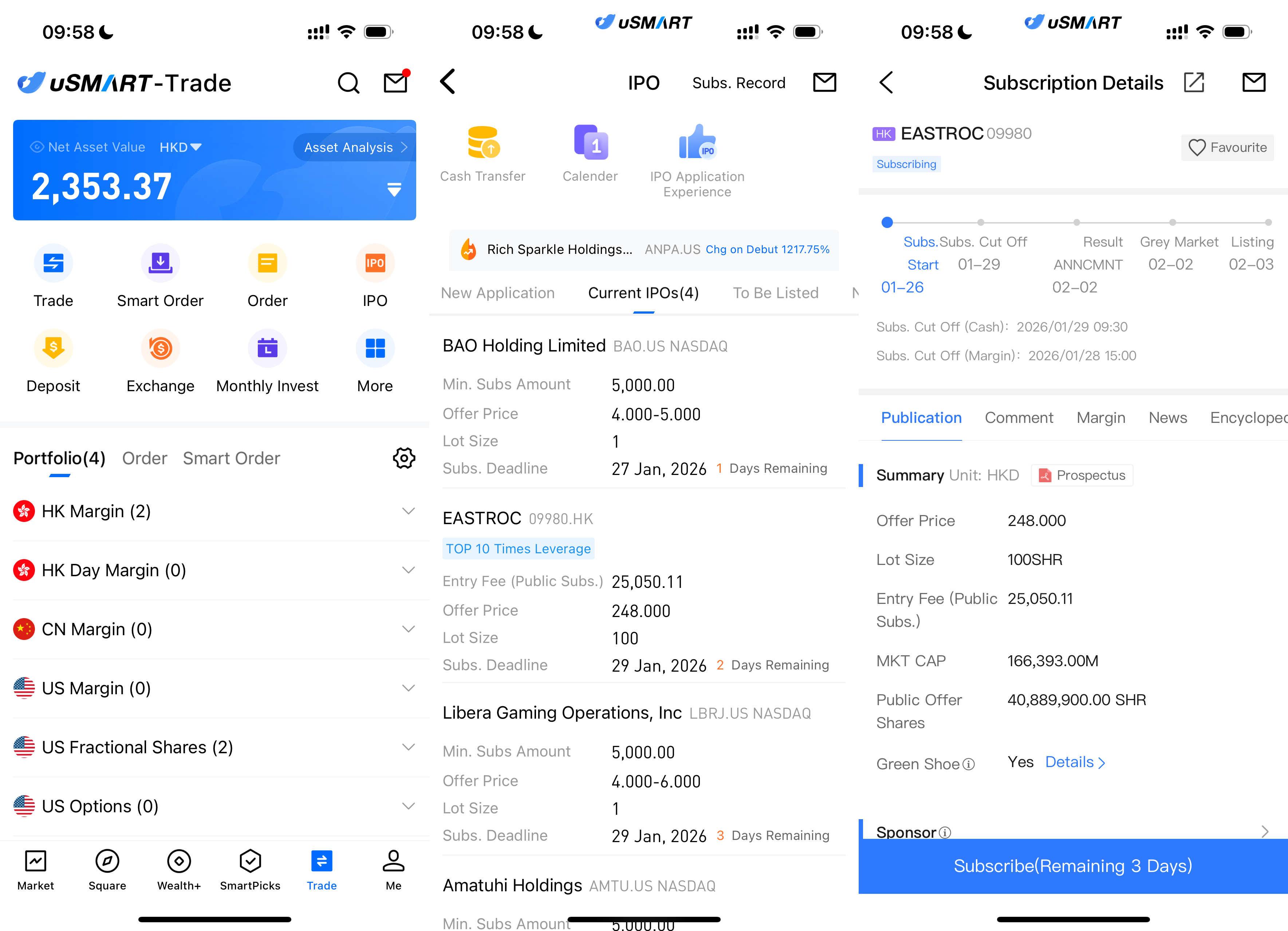 The uSMART HK App features an IPO Centre with exclusive perks, allowing clients to subscribe instantly to public offerings. After logging into the app, tap "Trade" at the bottom-right, go to "IPO Subscription," select Eastroc Beverage, tap "Public Offer," enter your subscription quantity, and submit your order.