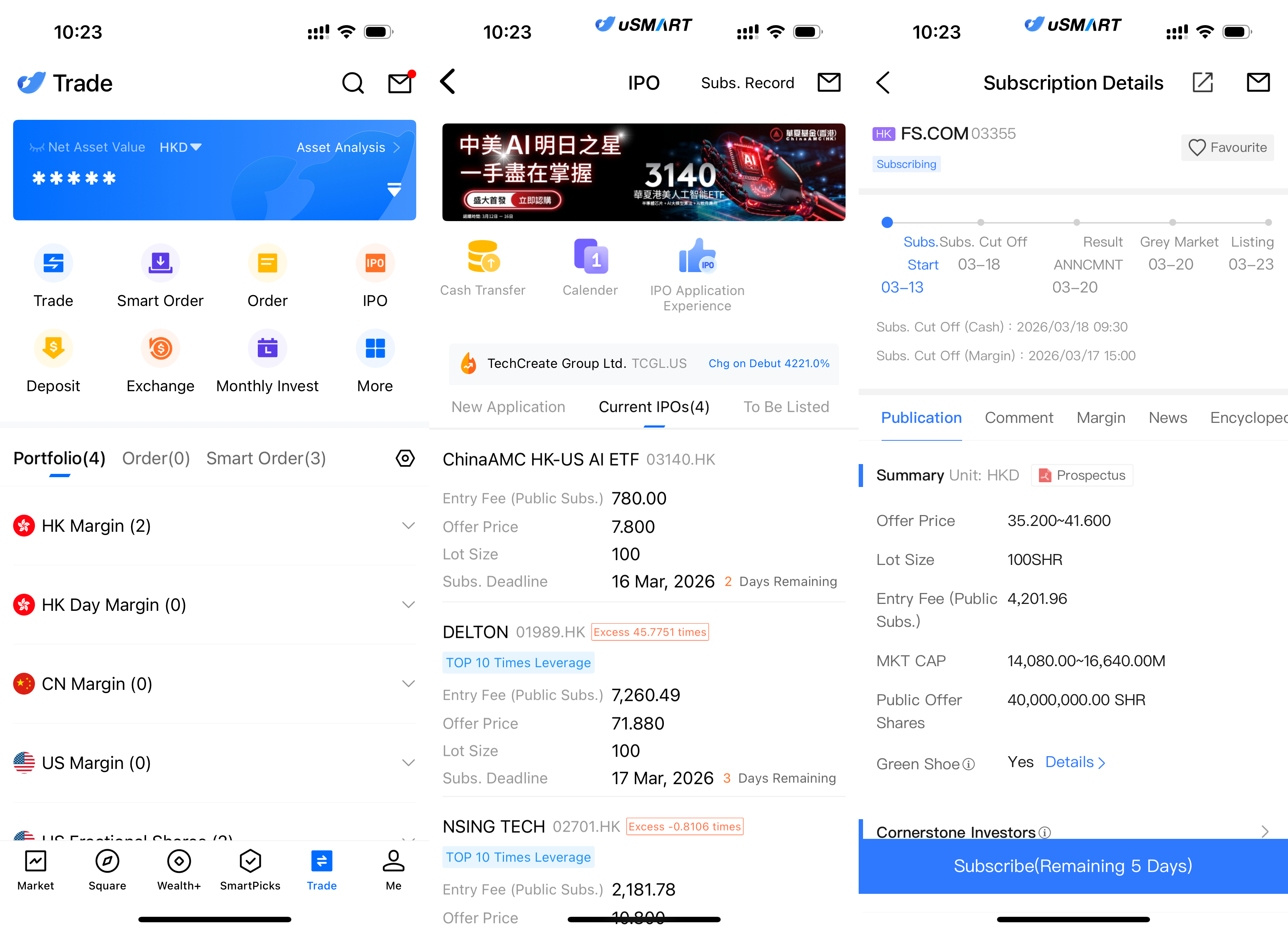 The uSMART HK App features an IPO Centre with exclusive perks, allowing clients to subscribe instantly to public offerings. After logging into the app, tap "Trade" at the bottom-right, go to "IPO Subscription," select FS.COM, tap "Public Offer," enter your subscription quantity, and submit your order.