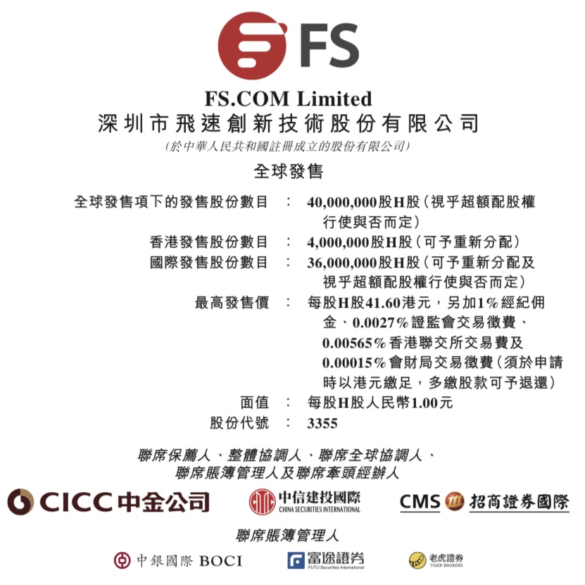 Shenzhen FS.COM Technology Co., Ltd. (FS.COM Limited, 03355.HK) has launched its Hong Kong IPO, with the subscription period running from March 13 to March 18. The company plans a global offering of 40,000,000 H shares, with a 15% overallotment option. The offer price is set between HK$35.20 and HK$41.60 per share, with a board lot of 100 shares and an estimated minimum investment of approximately HK$4,201.96. The stock is expected to debut on the Main Board of the Hong Kong Stock Exchange on March 23. CICC, CSC Financial International, and China Merchants Securities International are the joint sponsors of the IPO.