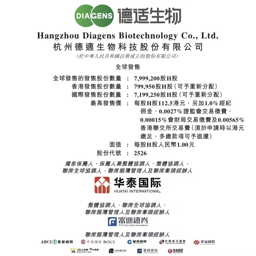 Hangzhou Diagens Biotechnology Co., Ltd. (02526.HK) has launched its Hong Kong IPO, with the offering period running from March 20 to March 25. The company plans to globally offer 7,999,200 H shares at a price range of HK$95.6 to HK$112.5 per share, with a board lot size of 50 shares and an entry fee of approximately HK$5,681.73. The shares are expected to be listed on the Main Board of the Hong Kong Stock Exchange on March 30. Huatai Financial Holdings (Hong Kong) Limited is acting as the sole sponsor.