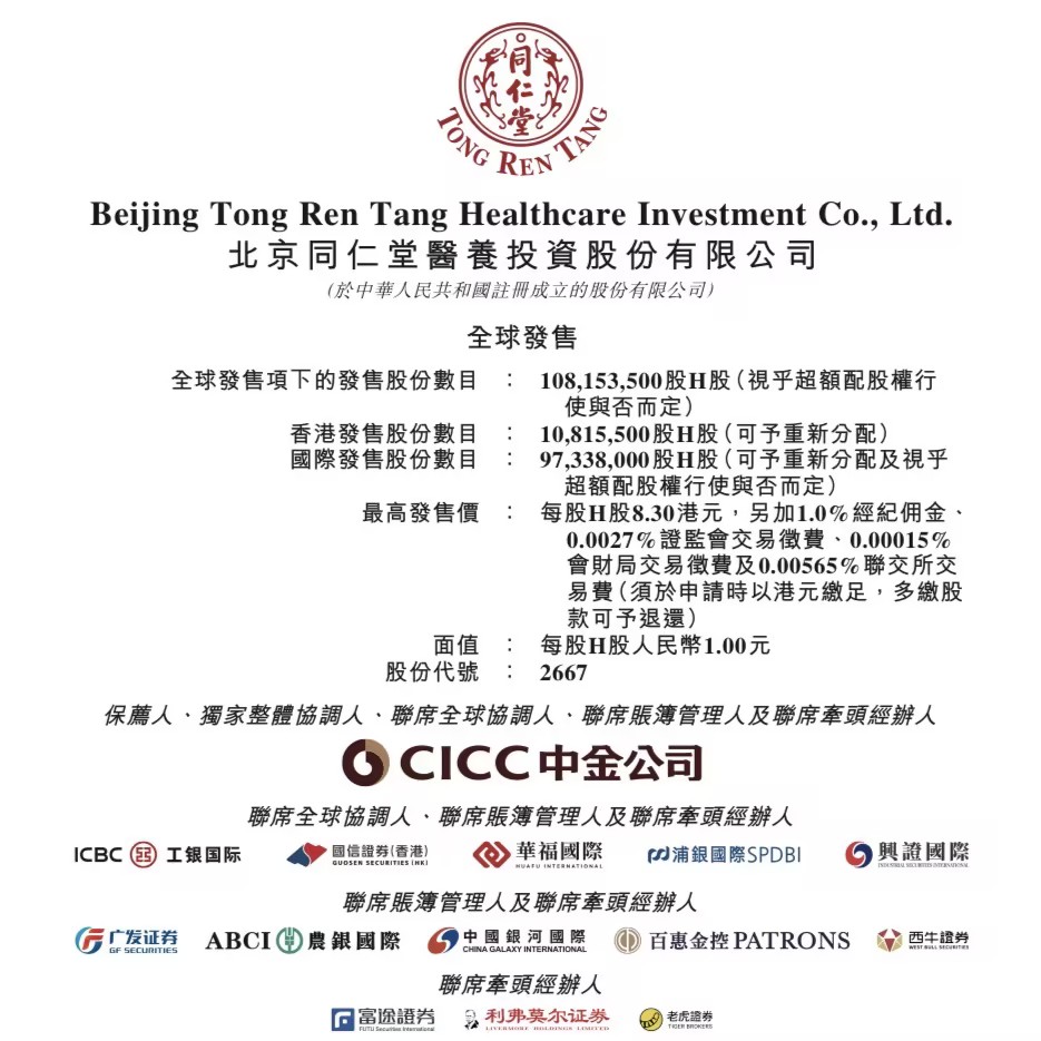 Beijing Tong Ren Tang Healthcare Investment Co., Ltd. (02667.HK) has also launched its Hong Kong IPO, with the offering period from March 20 to March 25. The company plans to globally offer approximately 108,153,500 H shares, with a 15% over-allotment option. The offer price ranges from HK$7.30 to HK$8.30 per share, with a board lot size of 500 shares and an entry fee of approximately HK$4,191.85. Listing is expected on March 30 on the Main Board of the Hong Kong Stock Exchange. China International Capital Corporation Hong Kong Securities Limited (CICC) is the sole sponsor.