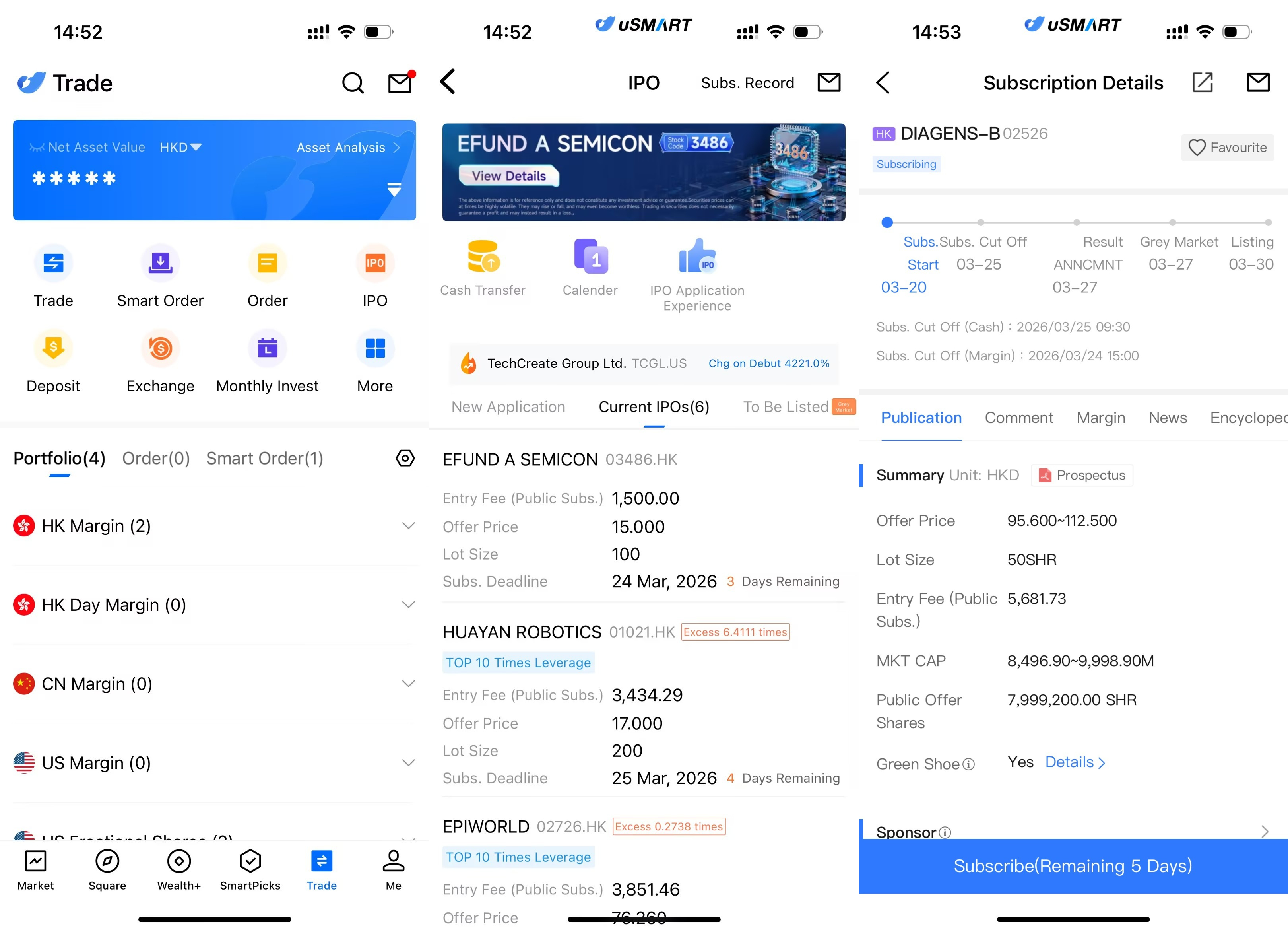 The uSMART HK App features an IPO Centre with exclusive perks, allowing clients to subscribe instantly to public offerings. After logging into the app, tap "Trade" at the bottom-right, go to "IPO Subscription," select Diagens&Tong Ren Tang Healthcare, tap "Public Offer," enter your subscription quantity, and submit your order.