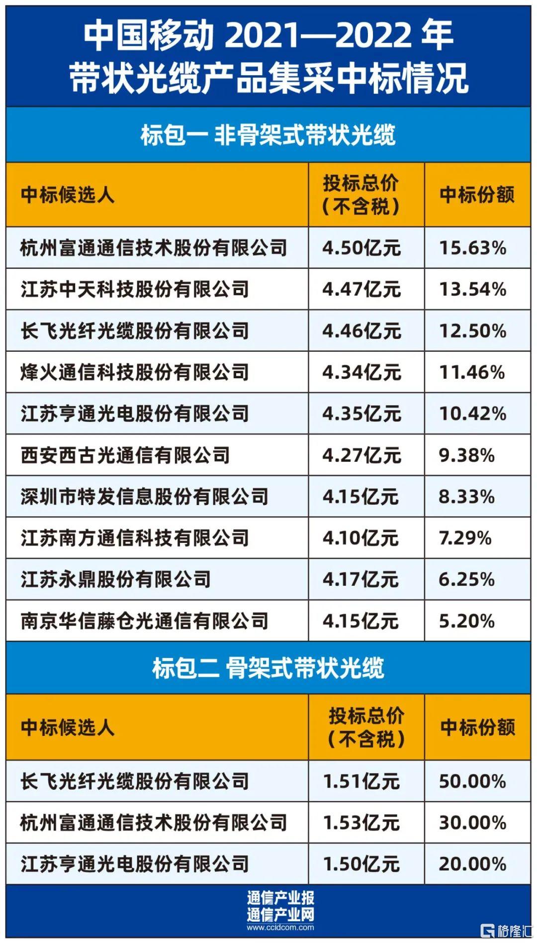 日前,中国移动公布了2021-2022年带状光缆集采中标候选人名单,长飞、亨通、烽火、中天等10家企业中标。