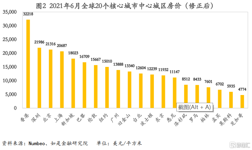 但是考虑到中国内地常用的为建筑面积,核心城市多为带电梯住宅,选用75%的得房率,进行折算后可以发现,深圳、北京和上海中心区域实际房价分别为21986美元/平方米、21316美元/平方米和20687美元/平方米,已经超过新加坡和巴黎,仅次于香港,且与香港差距进一步缩小。