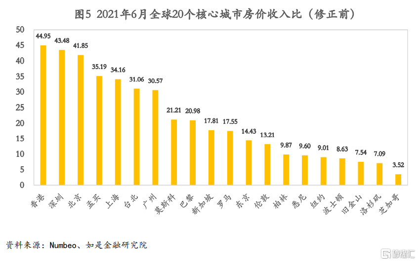 第一个指标是房价收入比:修正前仅次于香港,修正后全球最高。一般用于衡量房价相对居民收入的合理程度,比如京沪深中心城区的房价收入比平均达到34倍,意味着家庭储蓄34年以上才能买到一处中心城区普通住宅。Numbeo网站采用的是公寓价格中位数与家庭可支配收入中位数的比值,公寓价格选用中心区域和非中心区域房价均值,公寓中位数为90平方米,假设50%为女性劳动力,净可支配家庭收入定义为1.5倍平均净工资,在2021年6月份核心城市中心城区的最新房价收入比数据中,香港以44.95排名第一,深圳、北京、上海的房价收入比分别以43.48、41.85、34.16位居第二、第三、第五,遥遥领先其他城市,第四名孟买为35.19,和上海相差不大,第十名之后的城市房价收入比均在20以下。