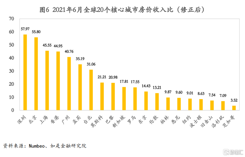 如果用得房率折算修正后的房价去计算房价收入比,那京沪深更是高的惊人,深圳、北京和上海分别达到57.97、55.80和45.55,均超过香港,成为全球买房负担最高的城市。
