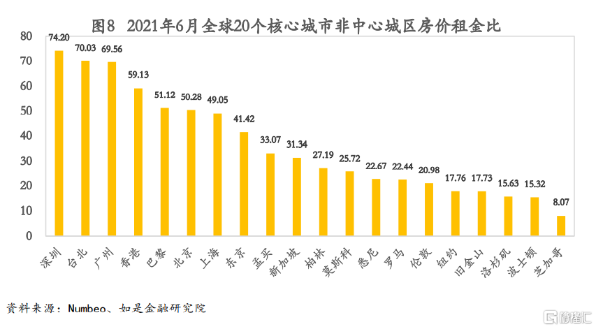 京沪深的中心城区和非中心城区的房价租金比均位于前列,租房的性价比要高得多。Numbeo在估算每平方米租金时假设一卧室公寓有50平方米,三卧室公寓有110平方米,未考虑税收或维护费用。在2021年6月核心城市最新房价租金比数据中,深圳、北京、上海中心城区的房价租金比分别以82.15、60.39、47.97位居第一、第五和第六;非中心城区中深圳也是位居第一,北京和上海名次各后退了一位,房价租金比均超过49。国际通行的临界点是25,超过临界值表明该区域房产投资价值变小,租房比买房更加经济。如前所述,租房的都是实际居住需求,买房的有些是投机需求,房价租金比高说明投机需求超过了实际居住需求,有一定的泡沫。
